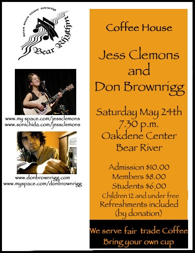 2008-05-112008-05-10 Bear River Arts and Action Music – Clemons & Brownrigg – May 24.08 Share this:Tweet Click to print (Opens in new window) Print Click to email a link to a friend (Opens in new window) Email Share on Tumblr Click to share on Reddit (Opens in new window) Reddit Like Loading... Related