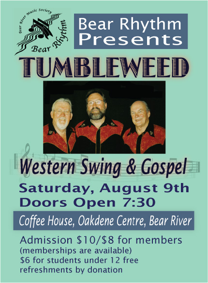 Bear Rhythm presents TUMBLEWEED at the Oakdene Centre in Bear River on Saturday, August 9, 2008. You can hear a sample of their music.