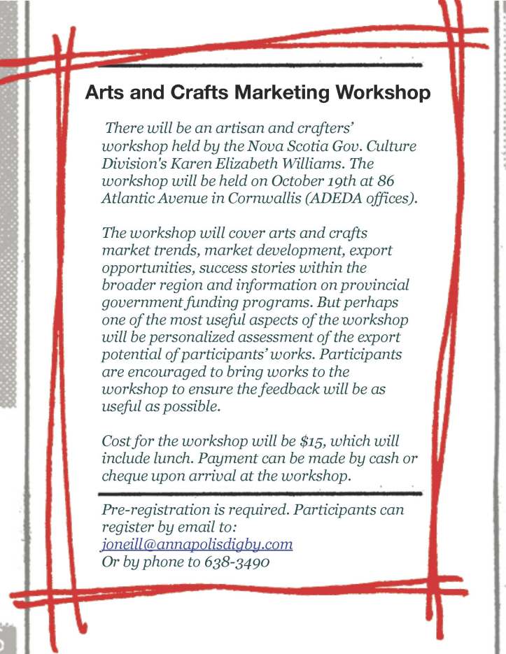 There will be a workshop held by Nova Scotia Gov. Culture Division’s on October 19 at 86 Atlantic Avenue in Cornwallis (ADEDA).