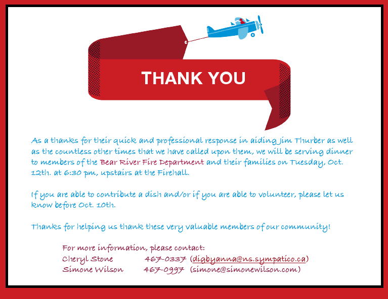 As a thanks for their quick and professional response in aiding Jim Thurber as well as the countless other times that we have called upon them, we will be serving dinner to members of the Bear River Fire Department on Tues. Oct 12 at 6:30 PM, upstairs at the Bear River Fire Hall.