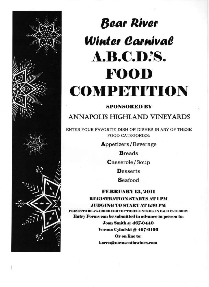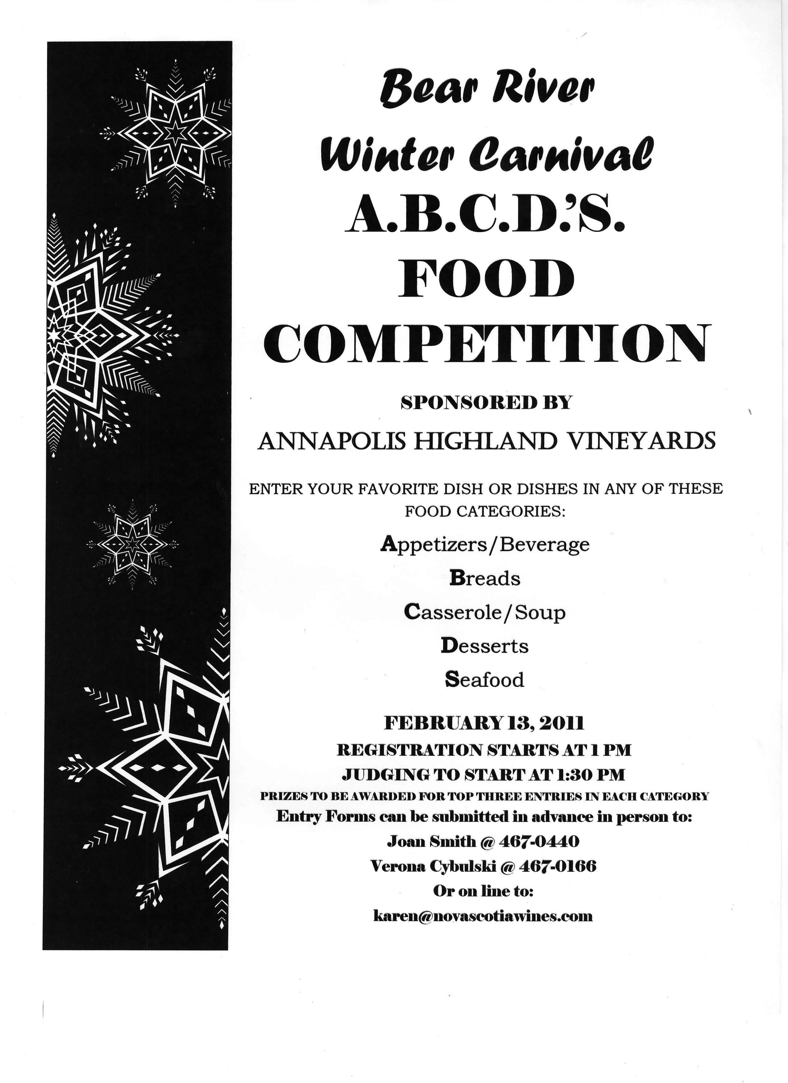 2011-02-022011-01-28 Flora Doehler Winter Carnival ABCD’s Food Competition – Feb 13.11 44.574954 -65.640113 Share this:Tweet Print (Opens in new window) Print Email a link to a friend (Opens in new window) Email Share on Tumblr Share on Reddit (Opens in new window) Reddit Like Loading... Related