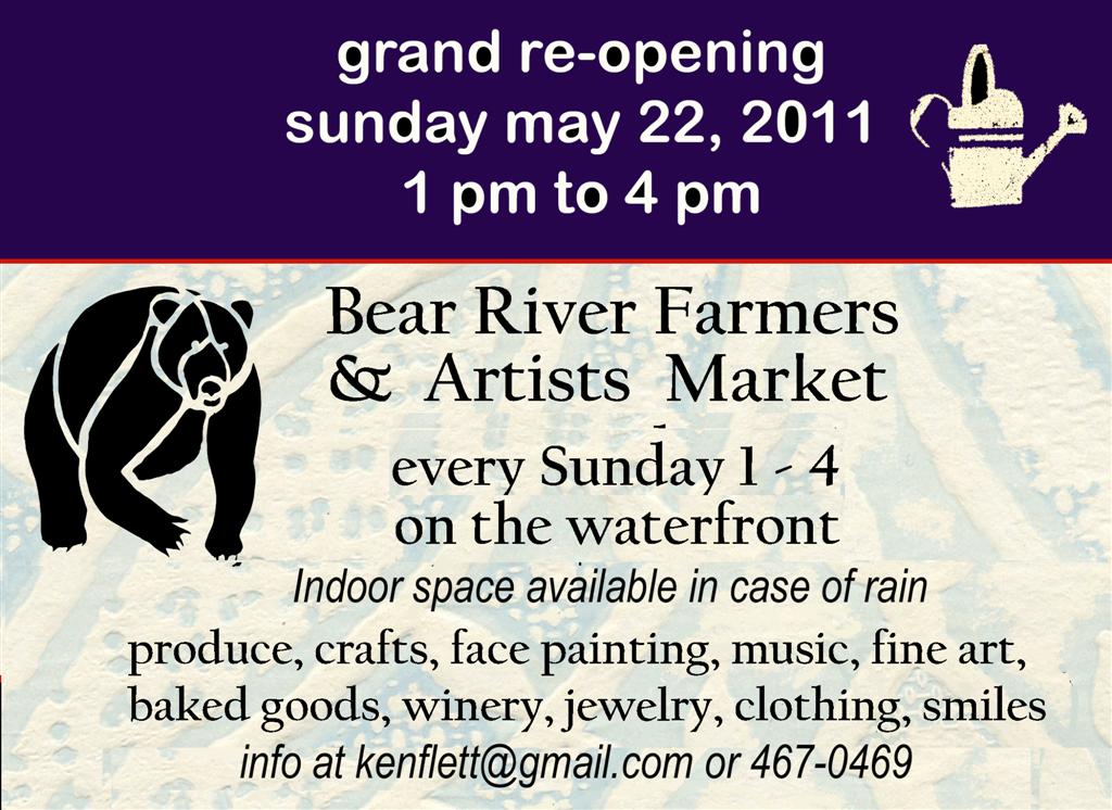 SUNDAY MAY 22.11 – Grand re-opening of the Bear River Farmers and Artists Market. Every Sunday on the waterfront from 1 pm to 4 pm. Produce, crafts, face painting, music, fin art, baked goods, fair trade coffee, winery, jewelry, clothing, smile.