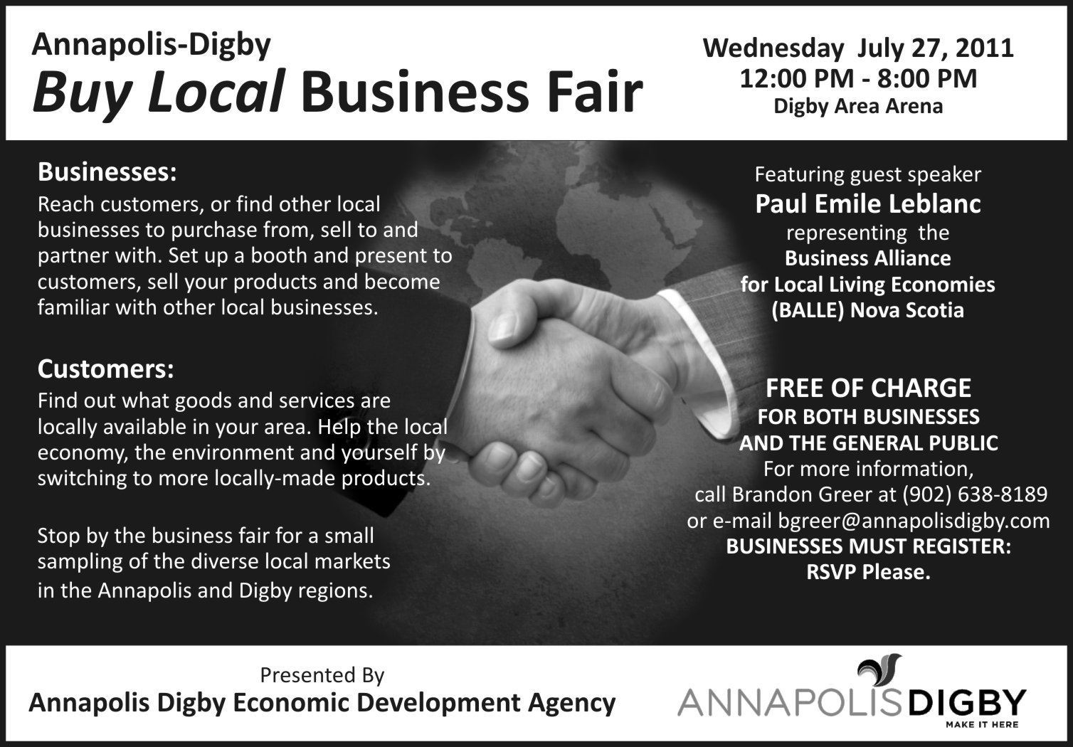 The Buy Local Business Fair is a free advertising opportunity for local businesses in a “trade show” format, and provides an opportunity for them to meet with other local providers of goods and services. ADEDA will provide some interesting information for local businesses as part of the registration package – including information on energy-efficiency rebates, business development funding opportunities, etc. It is being held at the Digby Area Arena from 12-8pm on Wed, July 27 – businesses may set up any time after 10am. Pre-registration is required to participate.