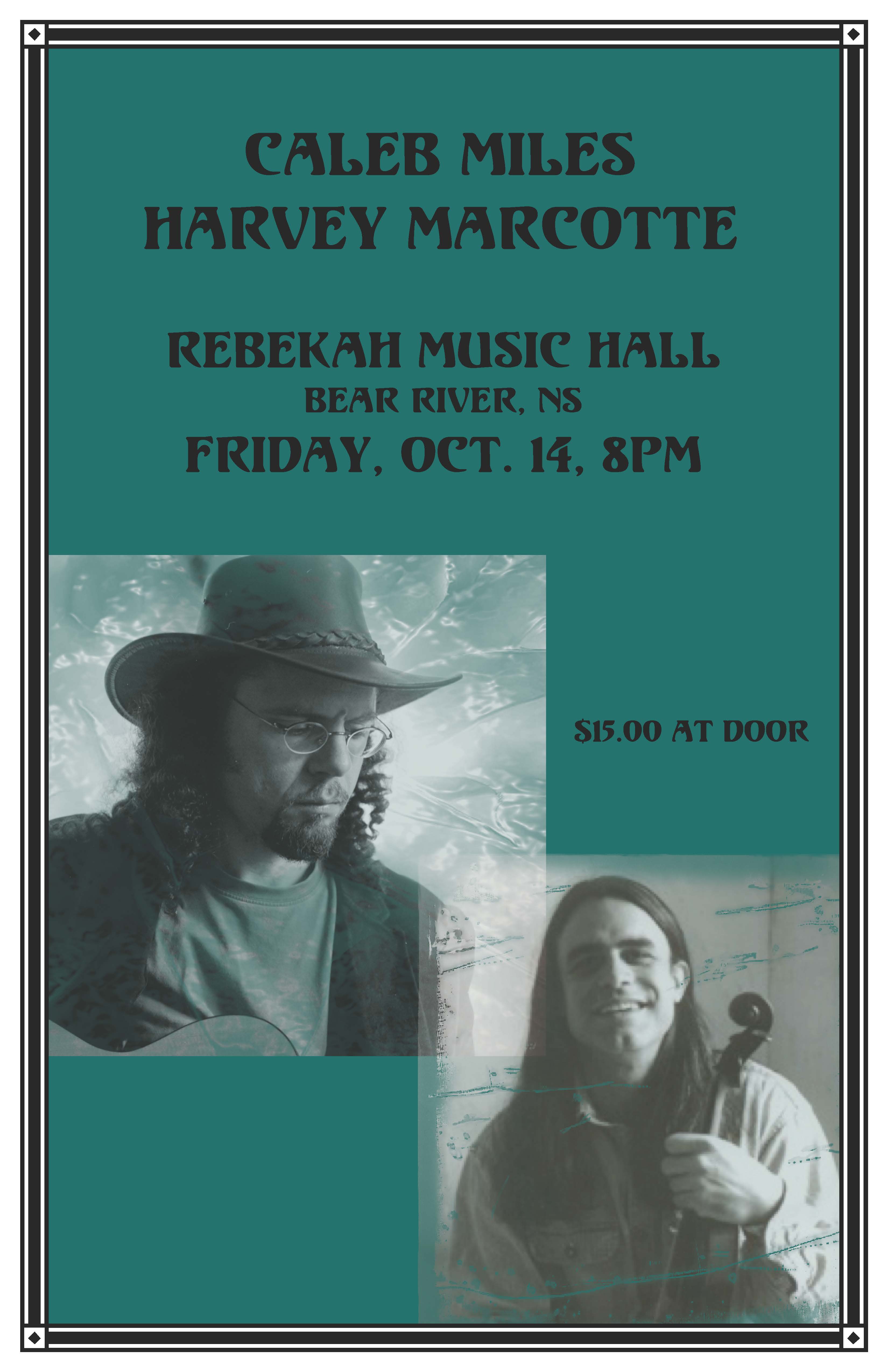 2011-10-042011-09-30 Flora Doehler Caleb Miles & Harvey Marcotte October 14.11 Caleb Miles and Harvey Marcotte perform in Bear River @the Rebekah Music Hall. 44.574954 -65.640113 Share this:Tweet Print (Opens in new window) Print Email a link to a friend (Opens in new window) Email Share on Tumblr Share on Reddit (Opens in new window) Reddit Like Loading... Related