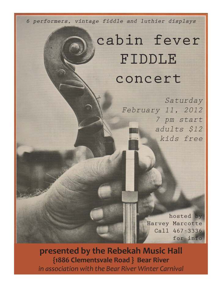 Bear River will be a’buzzing with activity this weekend for Winter Carnival 2012. Fiddlers and luthiers will be displaying their talents at the Cabin Fever Fiddle Festival this Saturday, 7:00 pm @ the Rebekah Music Hall. $12 at the door.