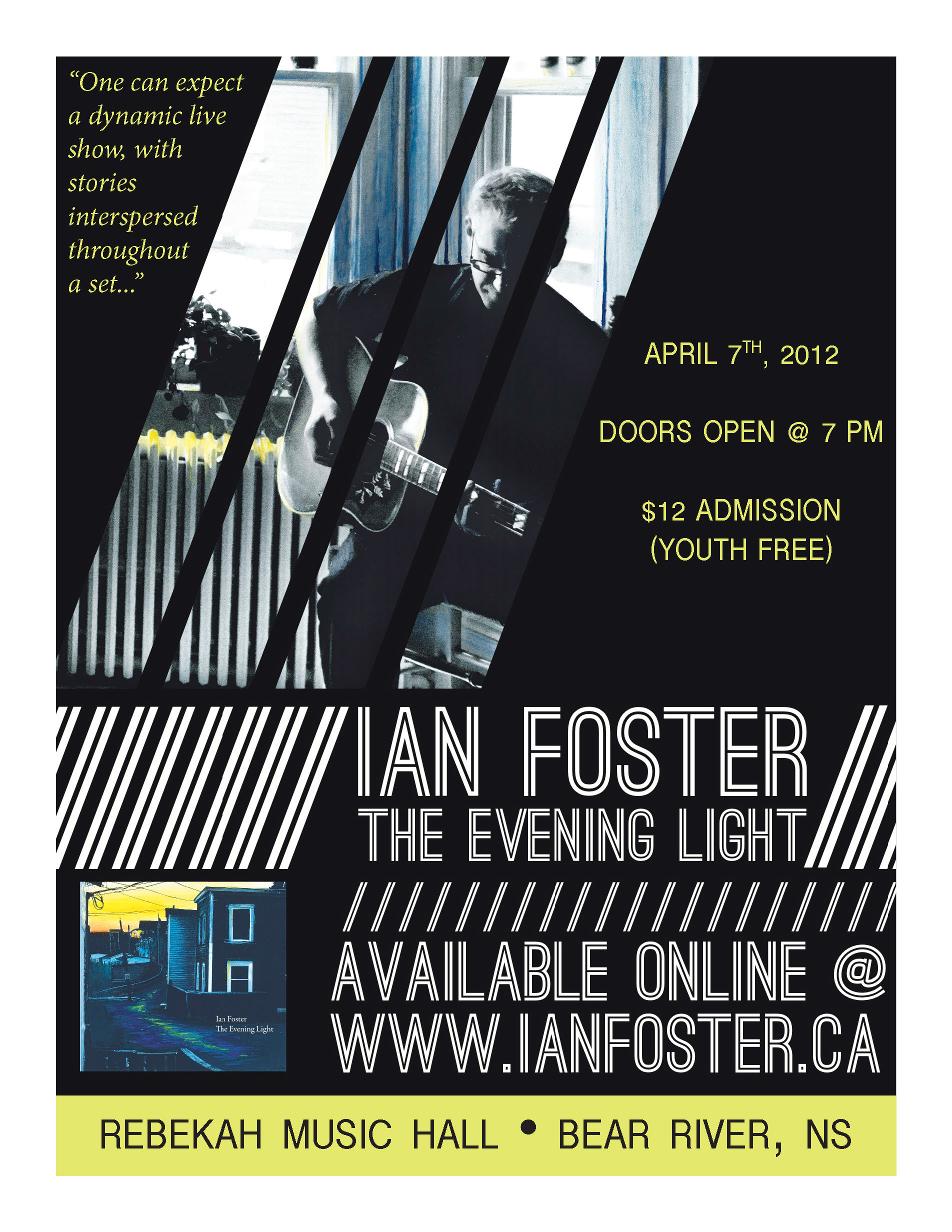 A multiple MusicNL and ECMA nominee (The Evening Light was nominated for Folk Recording of the Year at the 2012 ECMAs), Ian’s music has been played on radio internationally, from Newfoundland to the Netherlands. For more information, visit www.ianfoster.ca