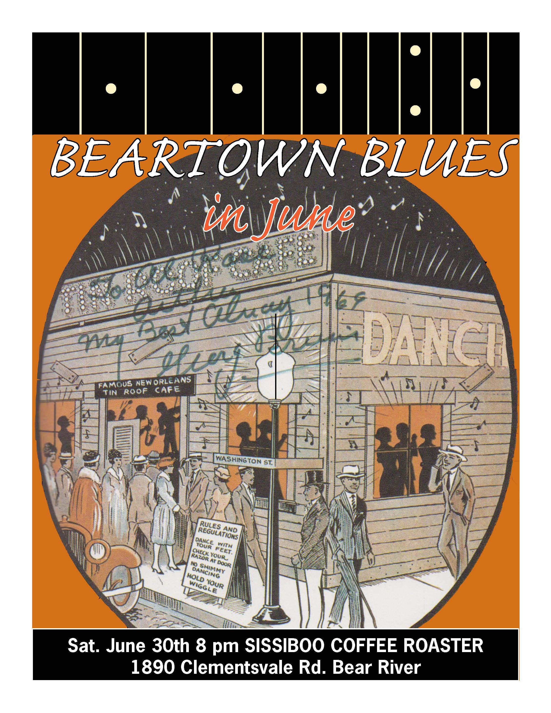 Join us for Beartown Blues on Saturday June 30th, 8 pm at Sissiboo Coffee Roaster (downstairs at the Rebekah Music Hall). Entry by donation. Come early as there is limited seating and it will fill up fast.
