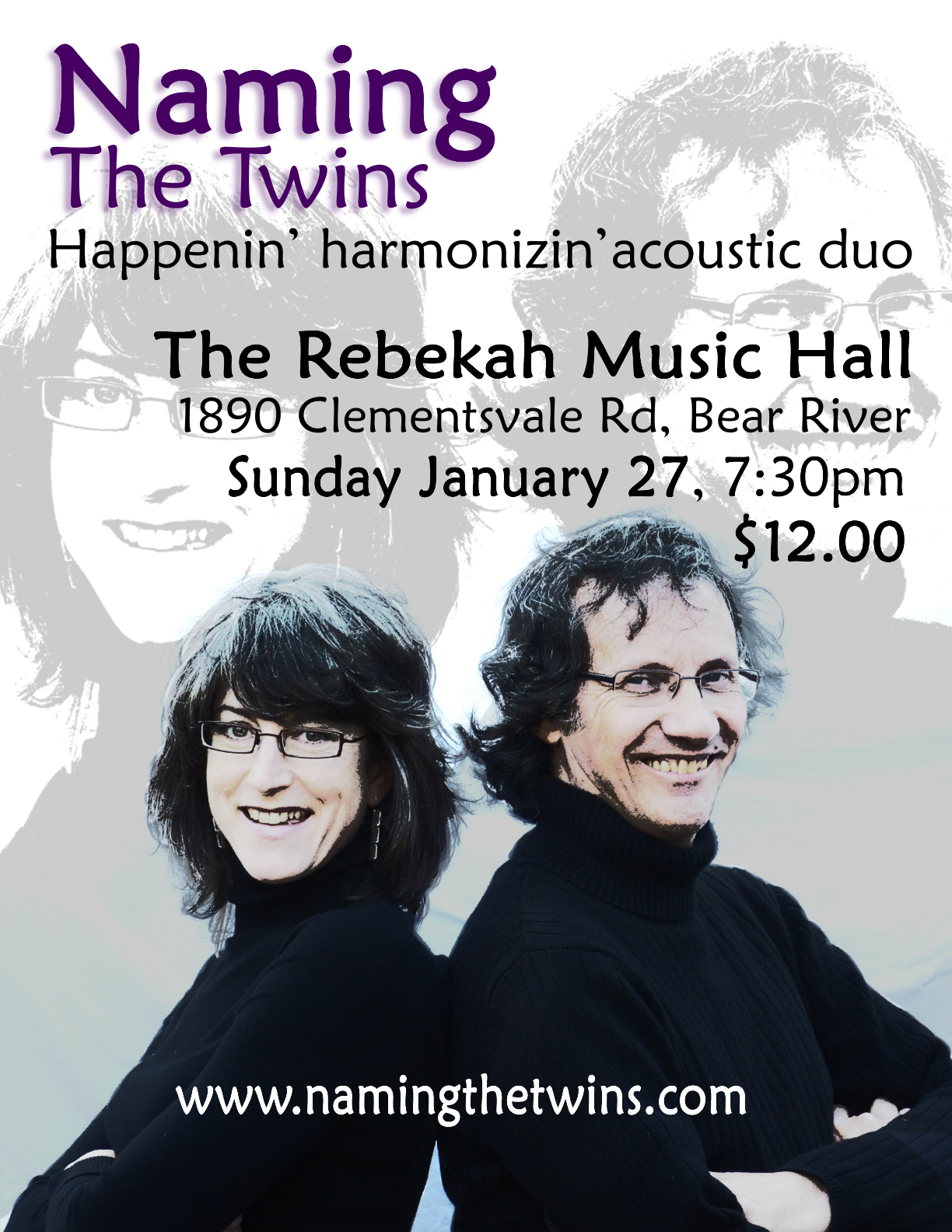 2013-01-05 Flora Doehler Naming the Twins – music @ the Rebekah Jan 27 SUNDAY, JANUARY 27 @ 7:30 pm – NAMING THE TWINS @ the Rebekah downstairs location (1890 Clementsvale Rd.) in Bear River. A harmonizing duo from Shelbourne Nova Scotia. $12 @ the door. 44.574954 -65.640113 Share this:Tweet Click to print (Opens in new window) Print Click to email a link to a friend (Opens in new window) Email Share on Tumblr Click to share on Reddit (Opens in new window) Reddit Like Loading... Related