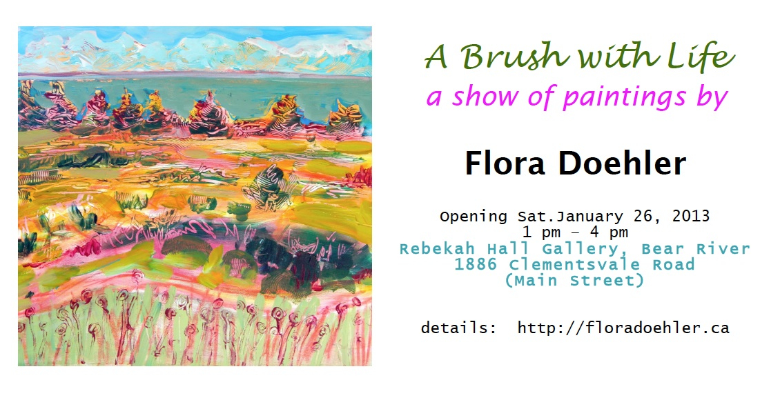 Saturday, January 26 – February 3: A BRUSH WITH LIFE: paintings by Flora Doehler @ the Rebekah downstairs location (1890 Clementsvale Rd.) in Bear River. Gallery opening with refreshments on Sat Jan 26, 1 – 4pm