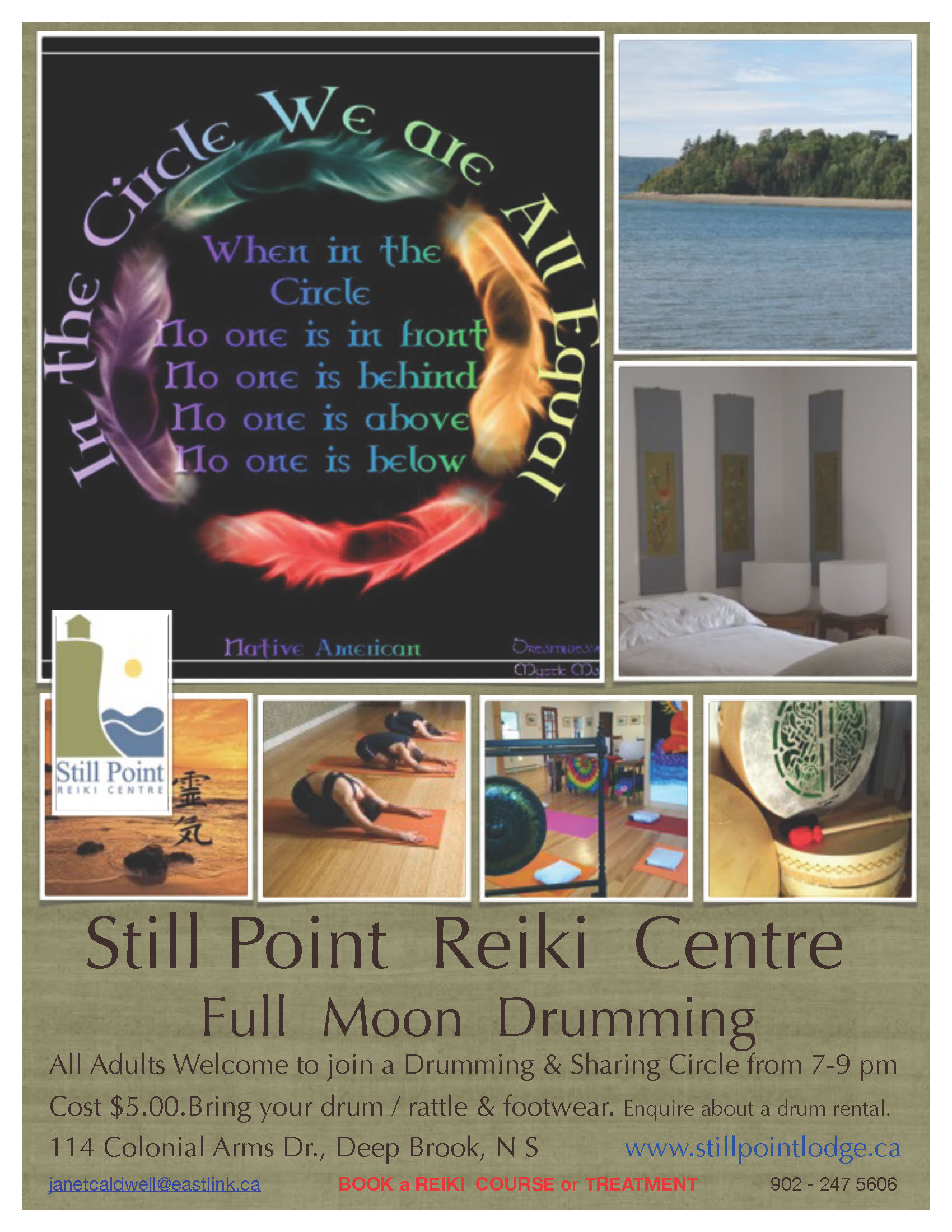 2013-07-21 Flora Doehler Full Moon Drumming – July 22.13 Still Point Reiki Centre presents Full Moon Drumming and Sharing Circle from 7-9 pm. Bring your own drum/ rattle and footwear. $5. 114 Colonial Arms Drive, Deep Brook, NS Share this:Tweet Click to print (Opens in new window) Print Click to email a link to a friend (Opens in new window) Email Share on Tumblr Click to share on Reddit (Opens in new window) Reddit Like Loading... Related