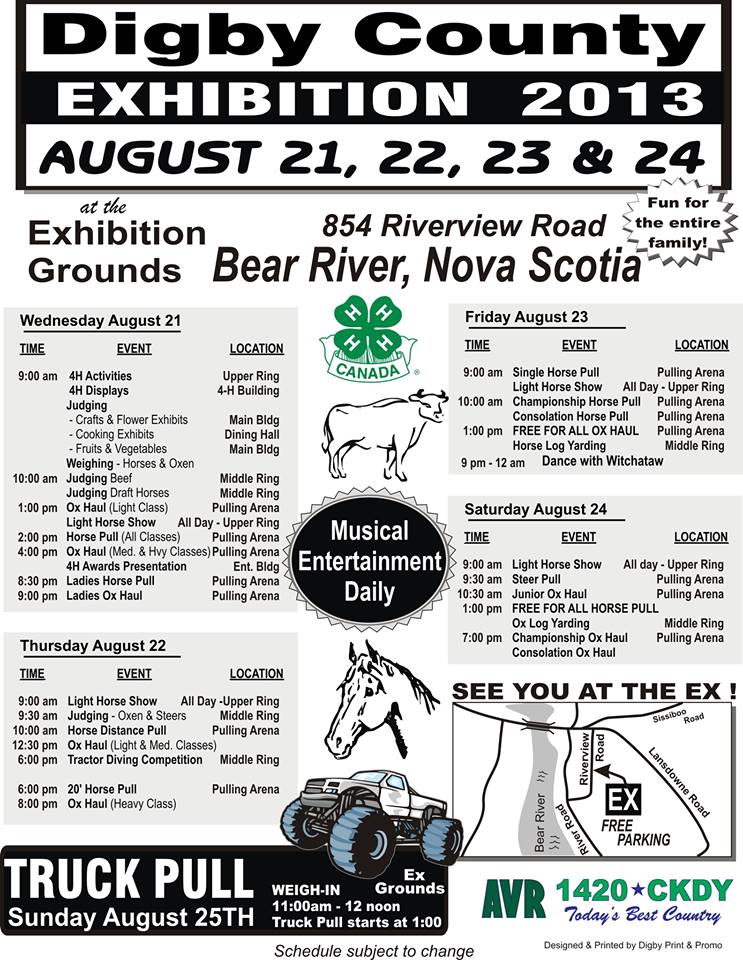2013-08-21 Flora Doehler Digby County Exhibition – 2013 Digby County Exhibition, Bear River August 21, 22, 23, & 24th Truck Pull on Sunday, August 25th Admission for each day is $5.00 Share this:Tweet Click to print (Opens in new window) Print Click to email a link to a friend (Opens in new window) Email Share on Tumblr Click to share on Reddit (Opens in new window) Reddit Like Loading... Related