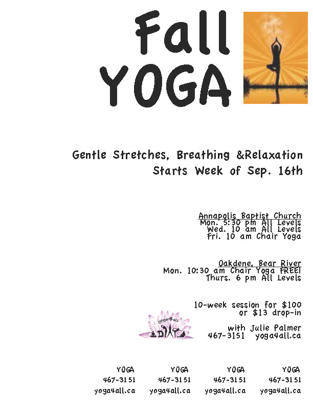 Register/Info: Julie Palmer at juliepalmer@eastlink.ca or 902-467-3151. www.yoga4all.ca. Classes also in Annapolis Royal.