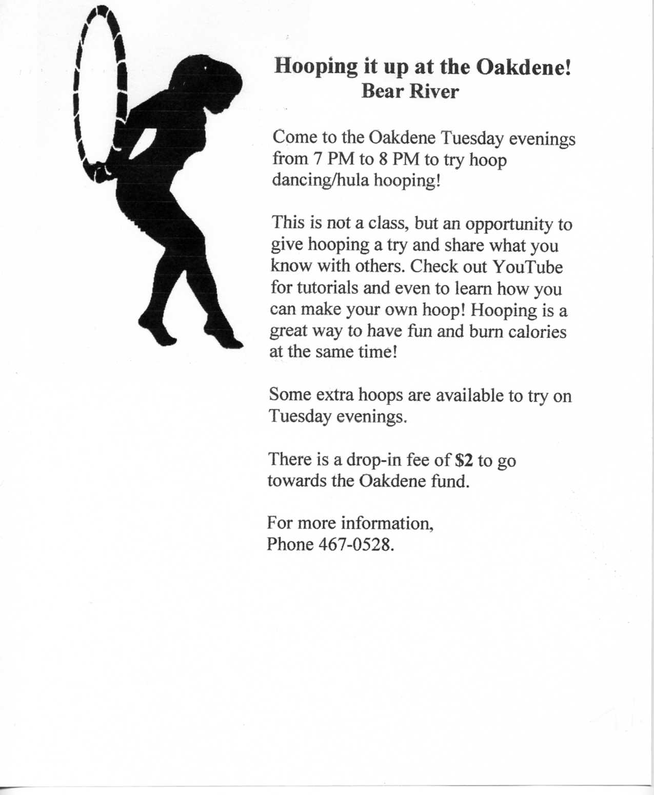2013-10-21 Flora Doehler Hula Hooping @ the Oakdene Tuesday nights Join the Hoop & Hula group in Bear River every Tuesday evening at 7pm at the Oakdene Center. 44.574954 -65.640113 Share this:Tweet Click to print (Opens in new window) Print Click to email a link to a friend (Opens in new window) Email Share on Tumblr Click to share on Reddit (Opens in new window) Reddit Like Loading... Related