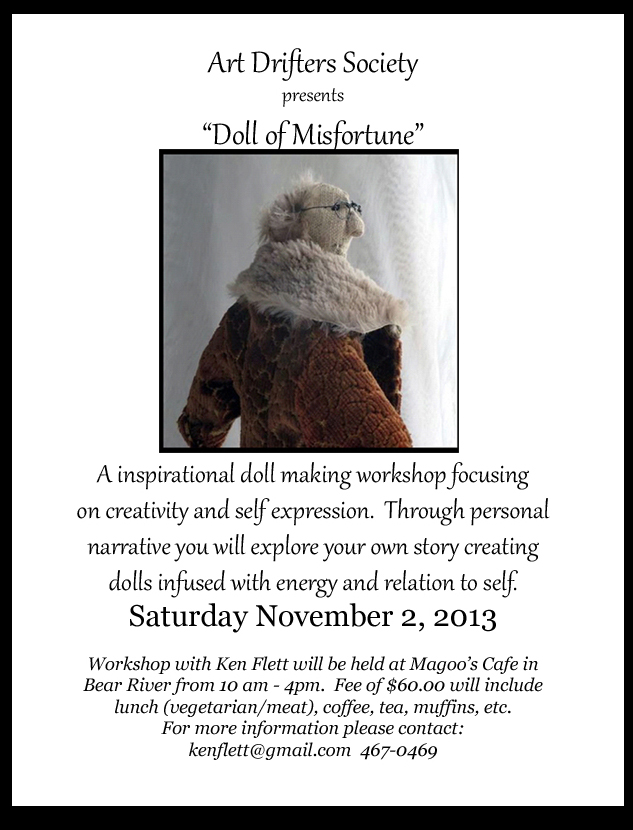 Ken Flett’s doll workshop will be held at Magoo’s Cafe in Bear River next Sat. Nov 2nd. A material list will be sent to you upon registration with Ken.