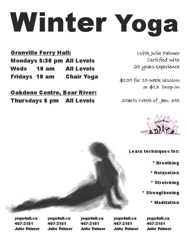 Winter Yoga in Bear River starts Thurs. Jan. 9th 6 pm at Oakdene. 10-week session for $100. Register/Info Julie Palmer 902-467-3151 or juliepalmer@eastlink.ca or http://www.yoga4all.ca. Julie has 20 years experience teaching yoga in the Kripalu tradition. Learn techniques for stretching, toning, breathing, meditation and relaxation.