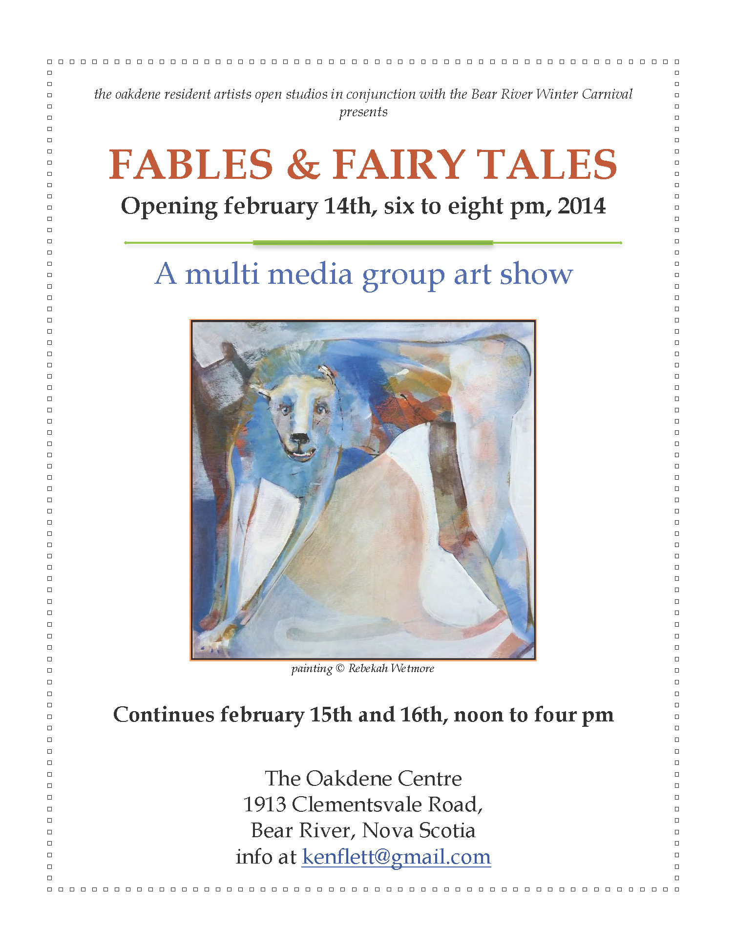 | An open invitation to all artists, any age, to submit to the “Fables and Fairy Tales” group show at the Oakdene Center. This show will be held in conjunction with open resident artists studios during the Bear River Winter Carnival. info at kenflett@gmail.com |