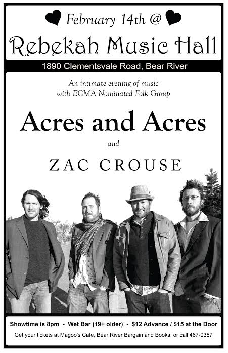 Bring a loved one in from the cold Friday February 14th and enjoy an intimate concert by Acres and Acres, ECMA nominated folk group. Show starts at 8 pm, downstairs at the Rebekah Music Hall, 1890 Clementsvale Road, Bear River. Tickets are $15 at the door, $12 in advance. Get your tickets at Magoo’s Cafe, Bear River Bargains and Books, Sissiboo Coffee stall at AR Farmer’s Market or call 467-0357 to reserve. Seating is limited and a wet-bar is on offer so this is a 19+ year event. See you there!