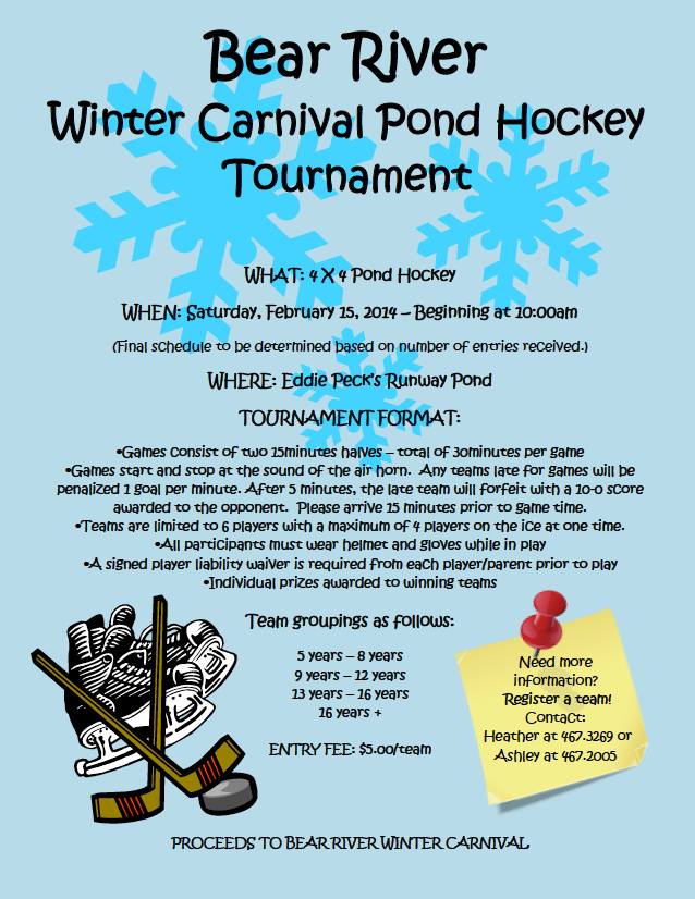 2014-02-11 Flora Doehler Winter Carnival Pond Hockey – Feb 15, 2014 Here is another wonderful, wintery event for you. Gather up a five other friends and register in the Hockey tournament. 44.574954 -65.640113 Share this:Tweet Click to print (Opens in new window) Print Click to email a link to a friend (Opens in new window) Email Share on Tumblr Click to share on Reddit (Opens in new window) Reddit Like Loading... Related