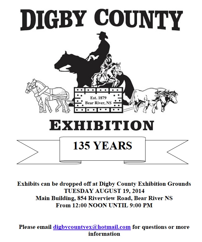 5) Raffle for one cord of split firewood, delivered within 25 KM of Digby County Exhibition grounds. Tickets are $5 each and can be purchased from any committee member! Draw is Aug 23, 2014.