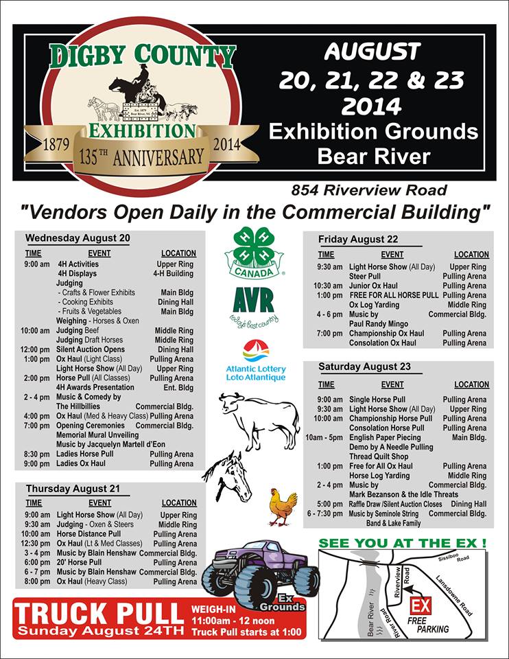This annual agricultural exhibition in Bear River celebrates its 135th anniversary this year. Opening tomorrow morning with 4H activities and much more. Please see the events poster below.