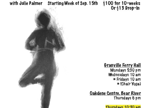 2. Yoga Props Workshop with Julie Jan. 30-Feb. 1st, 2015, Fri evg 7-9 pm. Sat & Sun 9-4 pm at Fall River Yoga Centre (near Hfx). “Balls ‘n Walls Blocks ‘n Socks Chairs ‘n Stairs Bolsters ‘n Ties”. Deepen your practice and add variety to your yoga classes by gaining ideas for ways to take yourself (or your students) deeper in yoga practice using props to safely and fully support each pose and to be creative and fun. Opportunity to work solo, in pairs and small groups. Certificate of Attendance and Handouts provided. Open to All Levels & Styles. $250 ($100 deposit required). Register with Julie Palmer 902-467-3151 or juliepalmer@eastlink.ca. Poster attached below.
