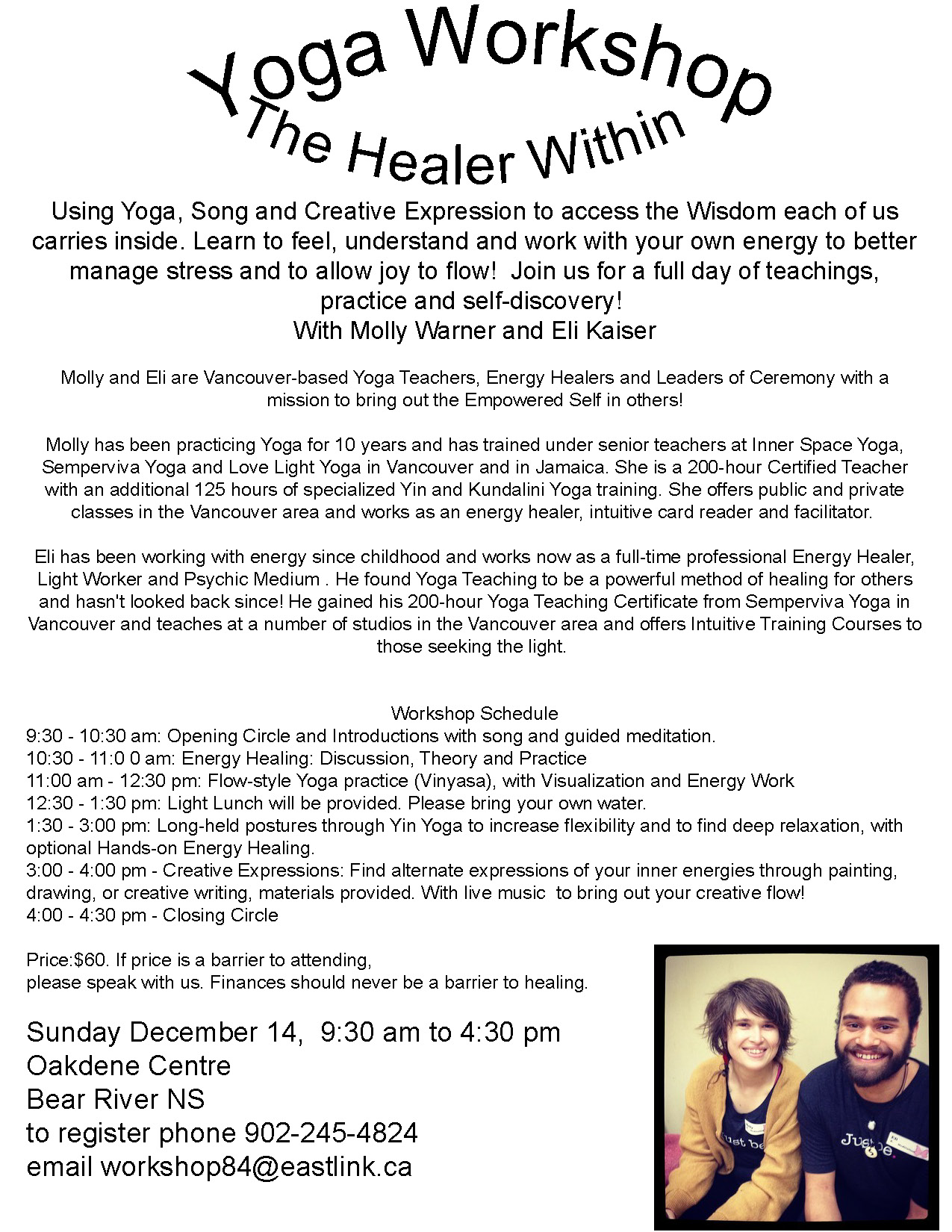 1:30 – 3:00 pm: Long-held postures through Yin Yoga to increase flexibility and to find deep relaxation, with optional Hands-on Energy Healing.
