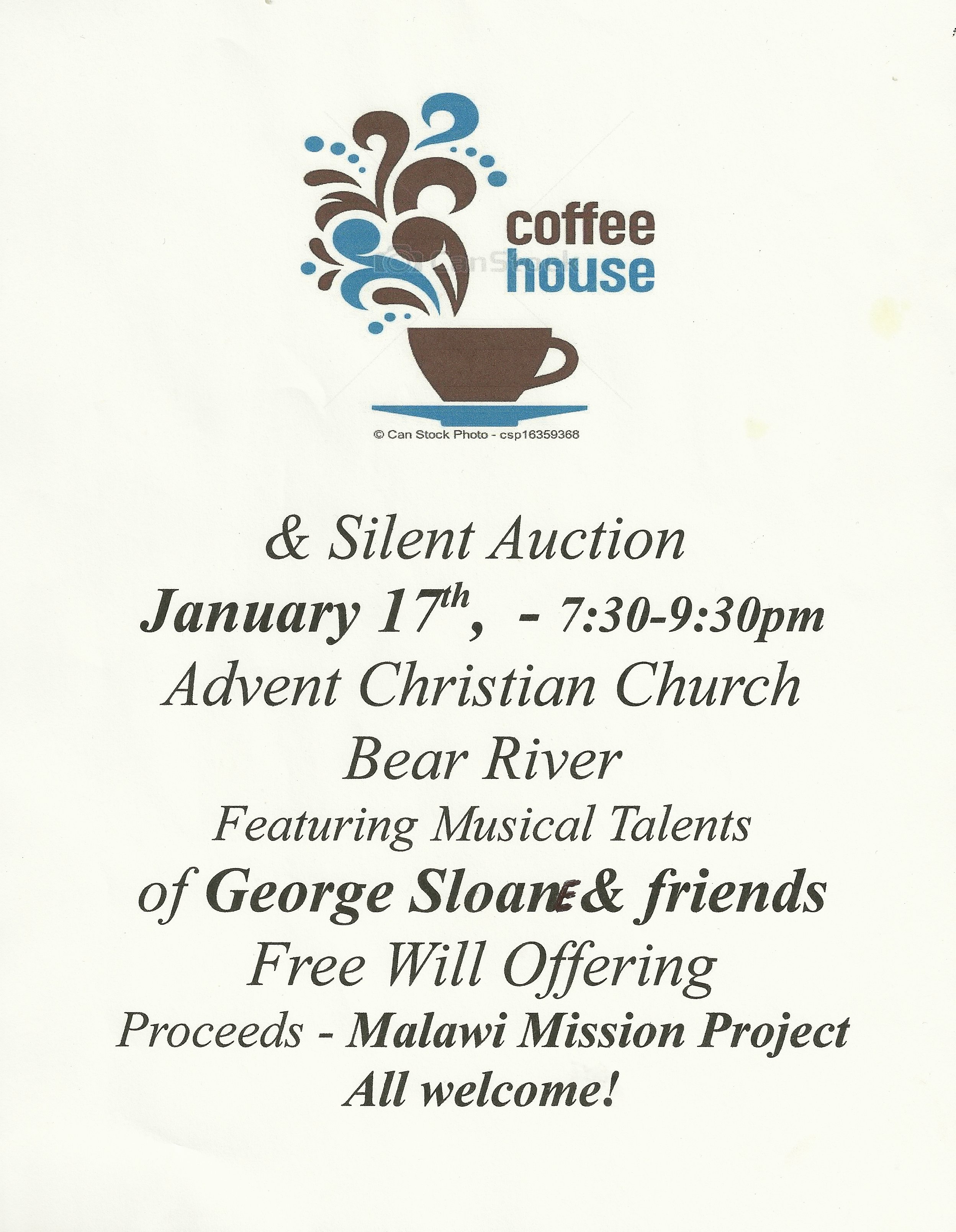 2015-01-06 Bear River Arts and Action Coffee House * Music * Silent Auction – Jan 17, 2015 Musical Coffee House and Silent Auction at the Bear River Advent Church January 17, 2015 – 7:30 9:30 pm Featuring the musical talents of George Sloane and friends. Free Will Offering. Proceeds will go to the Malawi Mission Project. All Welcome! Share this:Tweet Click to print (Opens in new window) Print Click to email a link to a friend (Opens in new window) Email Share on Tumblr Click to share on Reddit (Opens in new window) Reddit Like Loading... Related