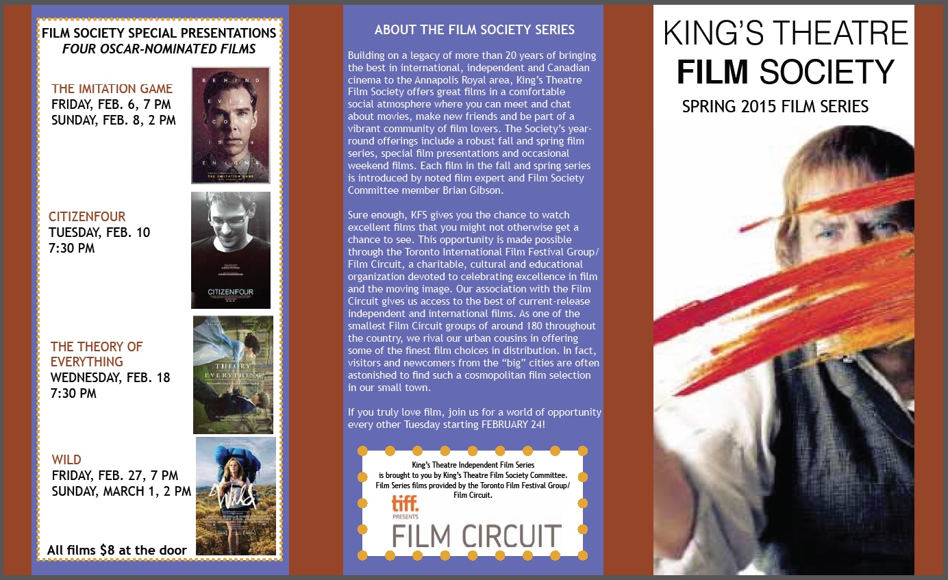 Throughout February, the Kings Theatre in Annapolis Royal will feature four Oscar-nominated films: Imitation Game, Citizenfour, The Theory of Everything, and Wild. Cost per film: $8 general admission.