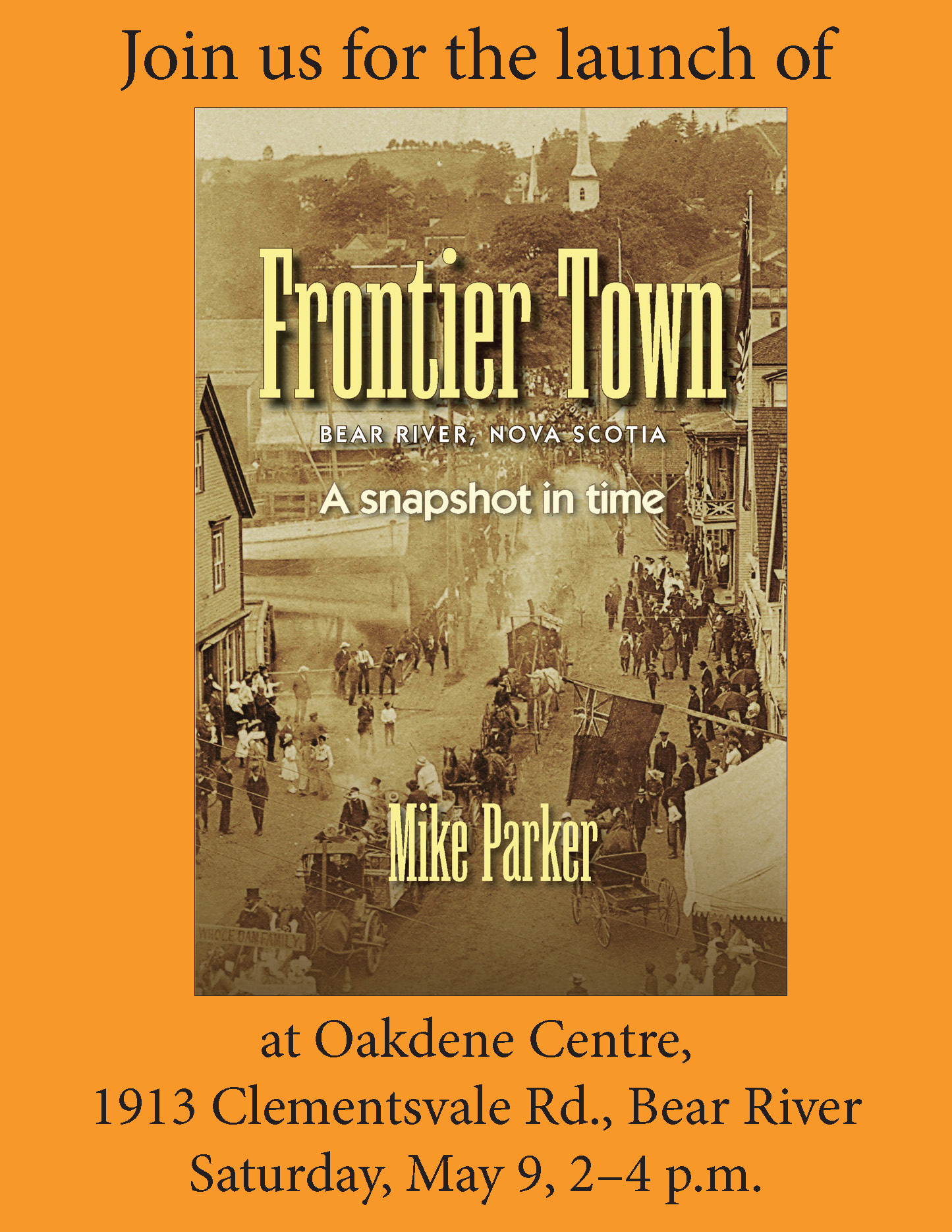 Mike Parker is looking forward to his visit to Bear River and Oakdene Centre on Saturday, May 9, 2–4 p.m.. Come along and say “hello”, pick up your copy of “Frontier Town’ and have it autographed.