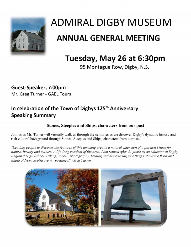 Join us as Mr. Turner will virtually walk us through the centuries as we discover Digby’s dynamic history and rich cultural background through Stones, Steeples and Ships, characters from our past.