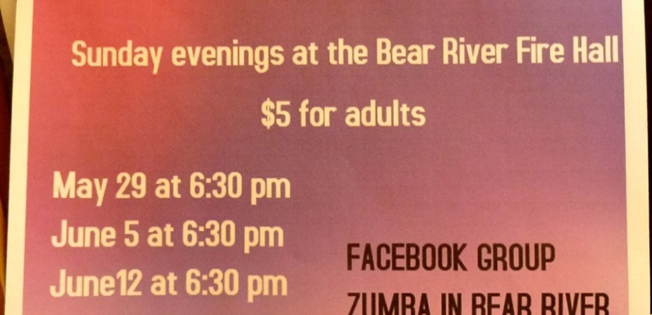 2016-06-04 Flora Doehler Zumba, Sunday evenings in Bear River Bear River Zumba is held weekly, Sunday evenings at the Bear River Fire Hall at 6:30 pm. Only $5 for adults. Share this:Tweet Click to print (Opens in new window) Print Click to email a link to a friend (Opens in new window) Email Share on Tumblr Click to share on Reddit (Opens in new window) Reddit Like Loading... Related
