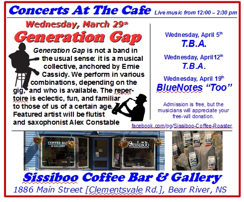 George Sloane and I have launched a new series of concerts, in conjunction with the Sissiboo Coffee Roasters Cafes. These will happen in Bear River, on Wednesdays, and in Annapolis Royal, on Saturdays. Start time is 12-noon, and the music will continue until 2:30.