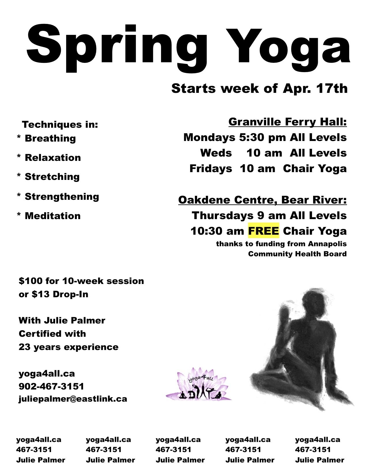 Spring yoga classes start Thurs Apr 20th at Oakdene Centre. 10-week session for $100. 9 to 10:15 am Mat yoga and 10:30-noon Chair Yoga (FREE due to funding from Annapolis Community Health Board). Classes also in Granville Ferry Hall near Annapolis. With Julie Palmer, E-RYT, who has 23 years teaching experience, 1000+ hours of training. Register/Info at juliepalmer@eastlink.ca or 902-467-3151 www.yoga4all.ca