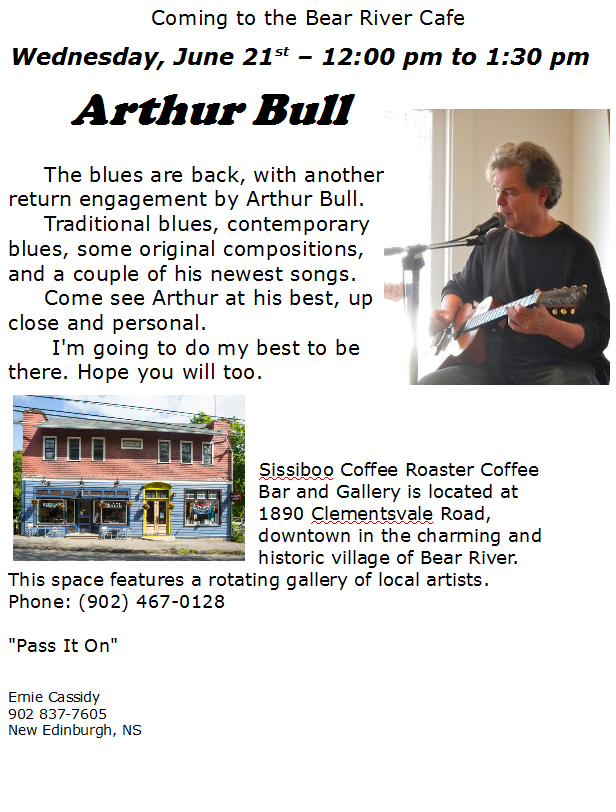 2017-06-192017-06-20 Flora Doehler Arthur Bull brings the Blues to Sissiboo Coffee – June 21 Arthur Bull brings the blues to Sissiboo Coffee Bar and Gallery Bear River June 21, noon – 1:30 by donation. Share this:Tweet Click to print (Opens in new window) Print Click to email a link to a friend (Opens in new window) Email Share on Tumblr Click to share on Reddit (Opens in new window) Reddit Like Loading... Related