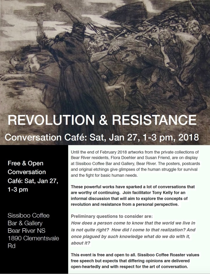 Until the end of February 2018 artworks from the private collections of Bear River residents, Flora Doehler and Susan Friend, are on display at Sissiboo Coffee Bar and Gallery, Bear River. The posters, postcards and original etchings give glimpses of the human struggle for survival and the fight for basic human needs.