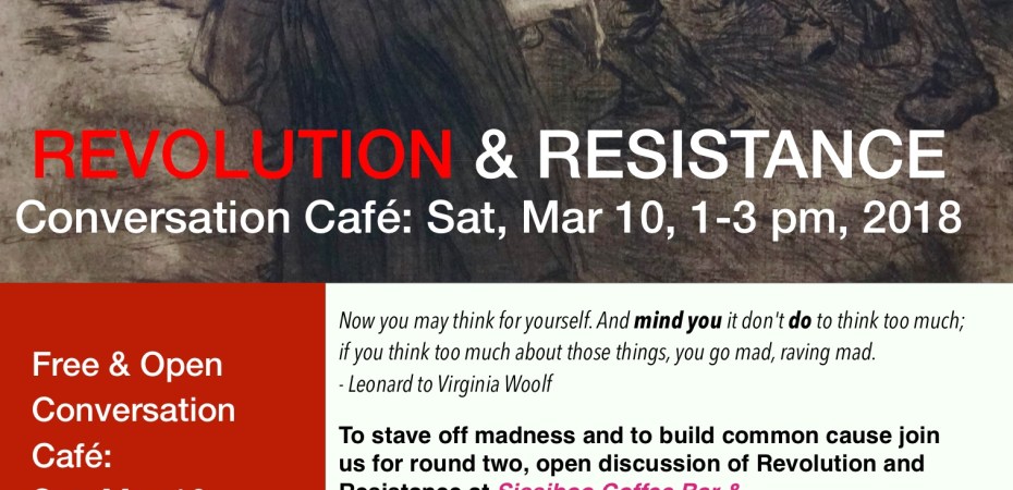 To stave off madness and to build common cause join us for round two, open discussion of Revolution and Resistance at