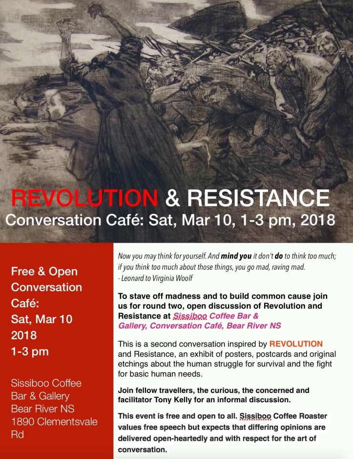 Join fellow travellers, the curious, the concerned and facilitator Tony Kelly for an informal discussion that will aim to explore the concepts of revolution and resistance from a personal perspective.