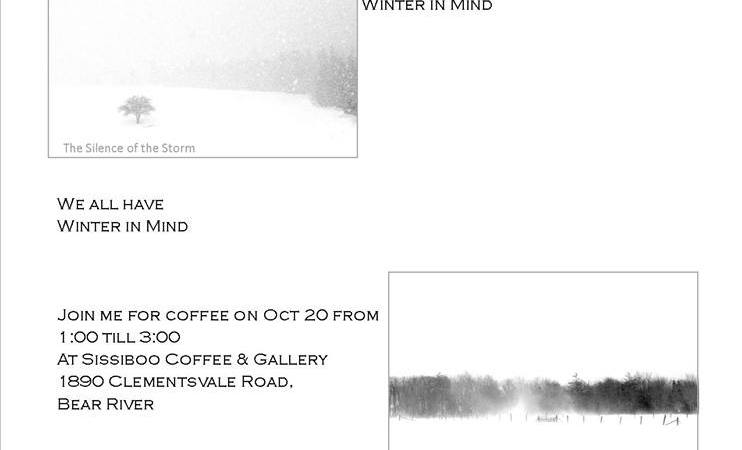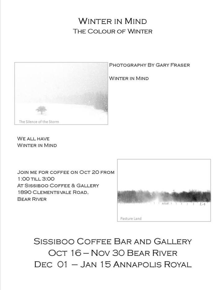 You are invited to meet photographer Gary Fraser at his show of winter photographs at Sissiboo Coffee Bar and Gallery, on Sunday, Oct 20 from 1-3pm.