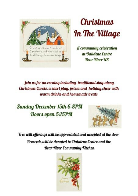 An evening of sing-along, traditional Christmas Carols, a short play, prizes and holiday cheer with warm drinks and homemade treats. Donate at the door with proceeds to the Oakdene Centre and Bear River Community Kitchen.