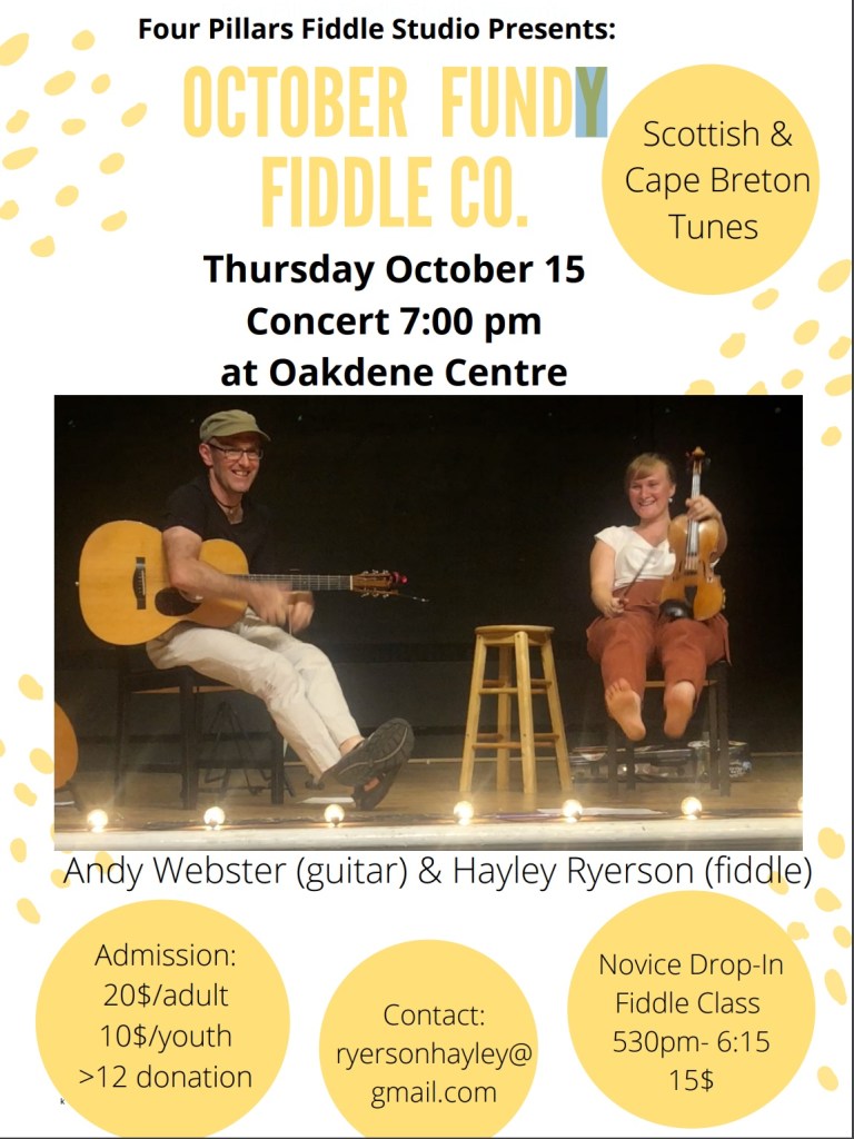 Hayley Ryerson (fiddle) & Andy Webster (guitar) are performing for October’s Fundy Fiddle Collective!