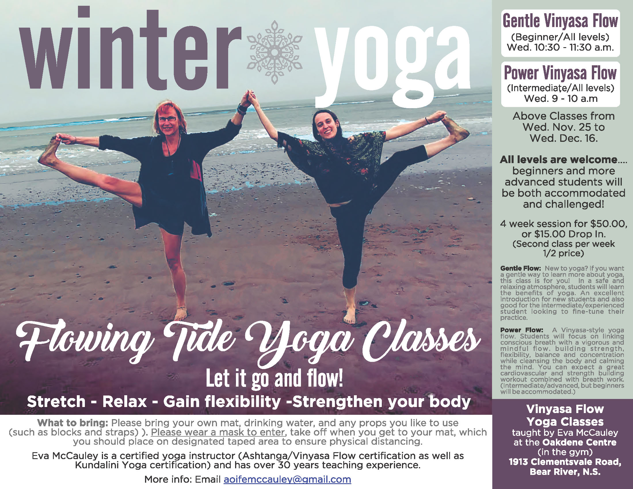 I’m happy to announce that I will be teaching another 4 week session of Vinyasa Flow Yoga classes (beginner & intermediate) on Wednesday mornings at the Oakdene Centre in Bear River, starting November 25th.