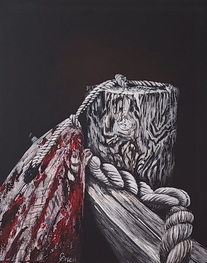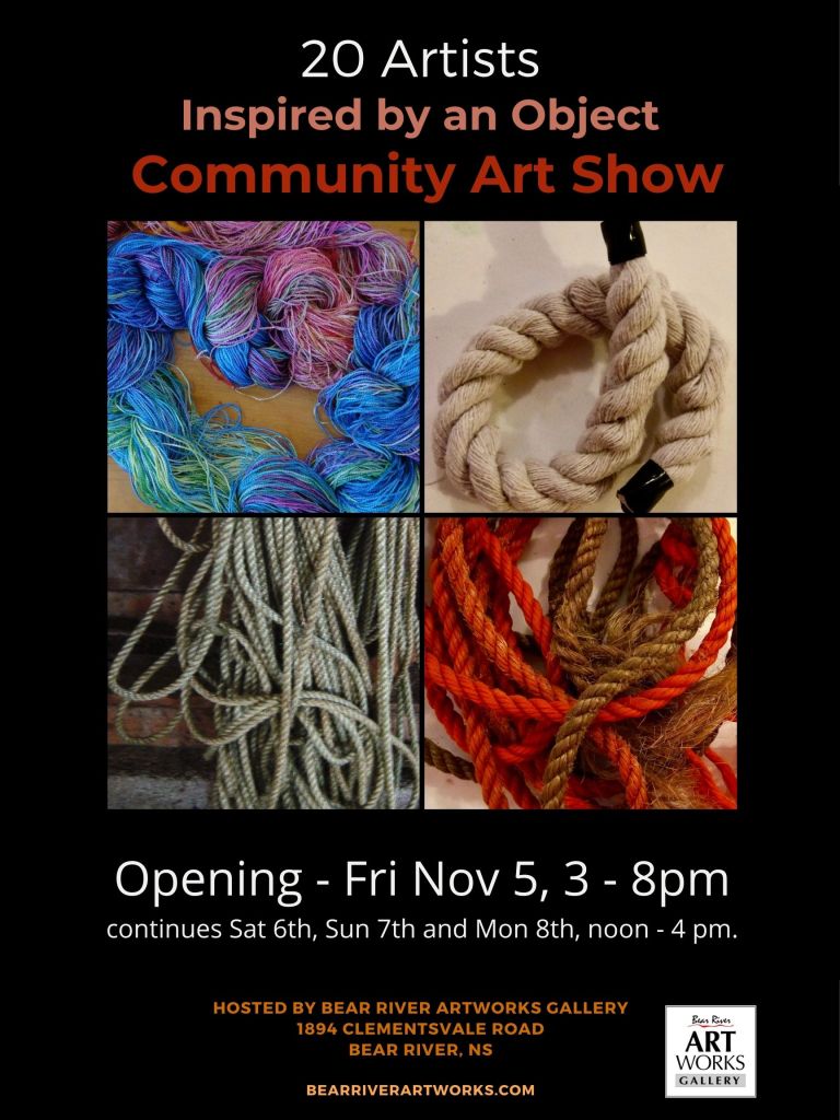 Please join us this Friday, Sat, Sun and Monday for a rare community art show at Bear River Artworks Gallery. (Next door to Sissiboo Coffee) The Gallery invited 20 artists from Bear River, Digby and Annapolis Royal and area to take a piece of rope or yarn and to either incorporate it into their work or to translate its personal significance in a painting, a photograph or a sculpture. Come in and see the results.