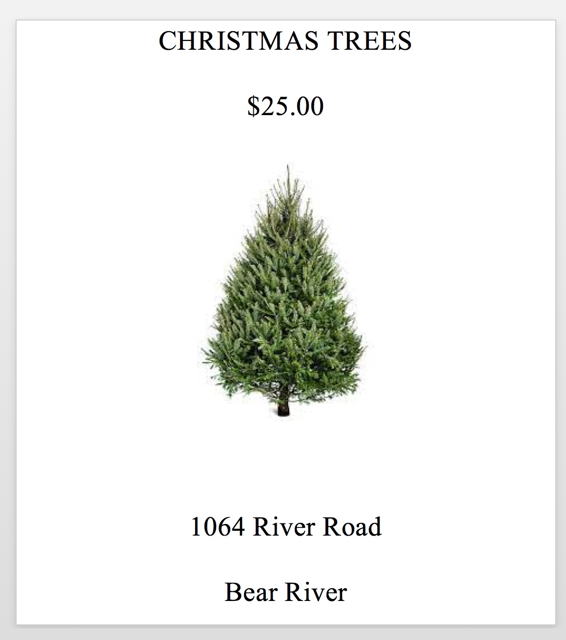 A wonderfully fragrant tradition in Bear River is the purchase of a freshly cut tree from the Banks family. Trees of all sizes are ready for your pick up on the corner of River Road and the road just past the Bear River Clinic if you are coming from the village.