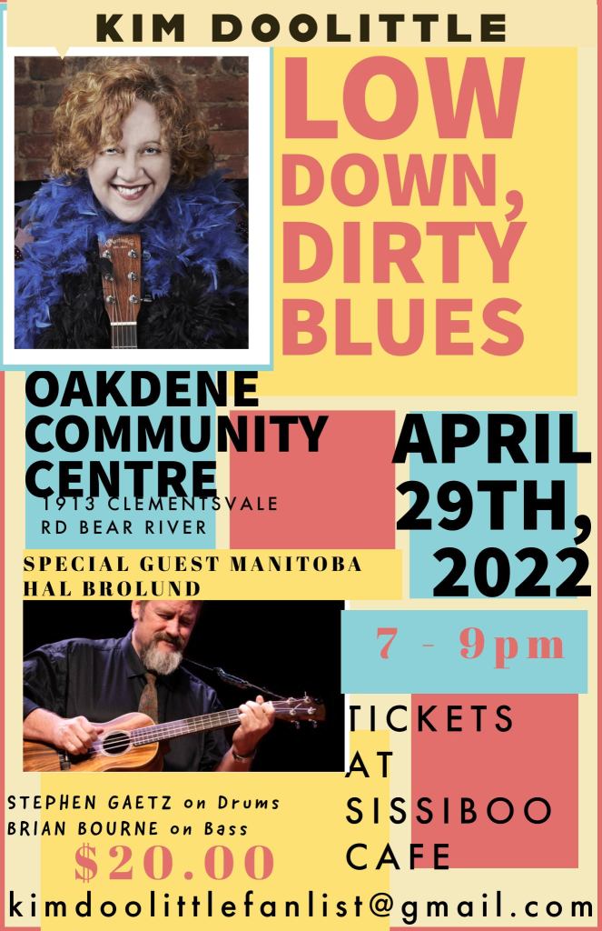 April 29/22 @7pm Kim Doolittle will be live with Special Guest Manitoba Hal on Slide and Ukulele, Brian Bourne on Bass and Chapman Stick and Stephen Gaetz on Drums. This is a full on blues show ranging from the 1920’s and spanning into the 2000’s.