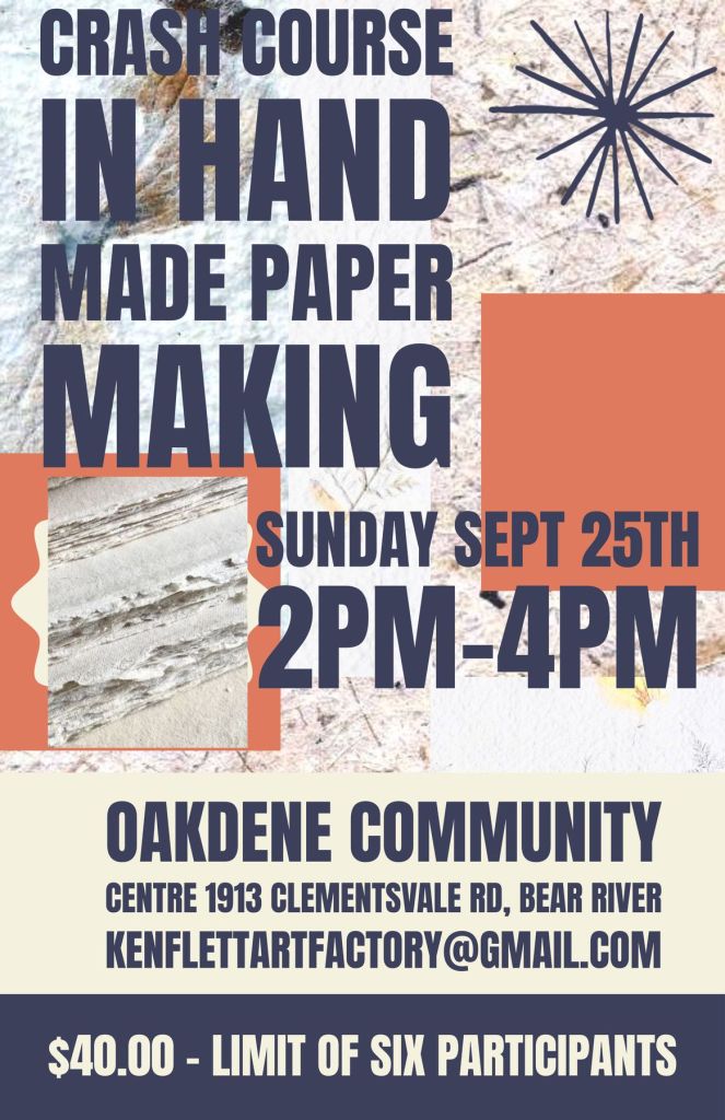 2022-09-192022-09-20 Flora Doehler Paper Making Workshop – Sept 25, 2022 2 hours crash course in making handmade paper. Sunday September 25th from 2pm – 4pm. Contact; kenflettartfactory@gmail.com if you have any questions. Share this:Tweet Click to print (Opens in new window) Print Click to email a link to a friend (Opens in new window) Email Share on Tumblr Click to share on Reddit (Opens in new window) Reddit Like Loading... Related