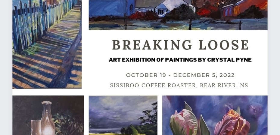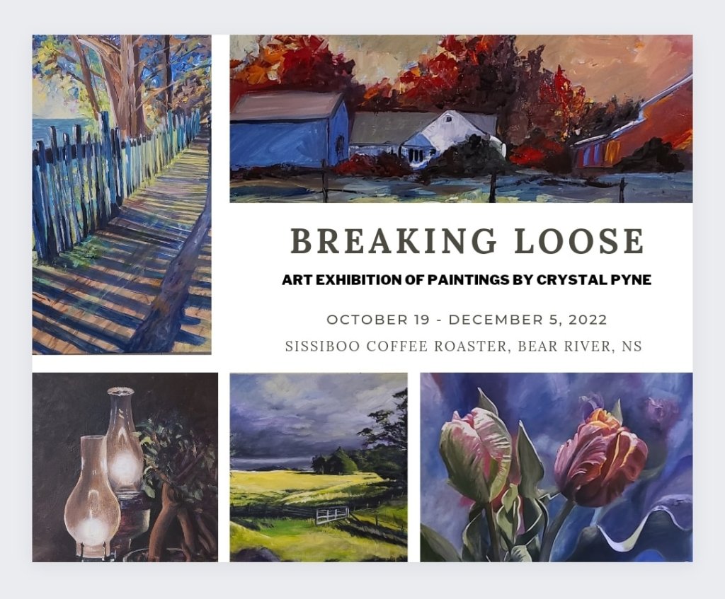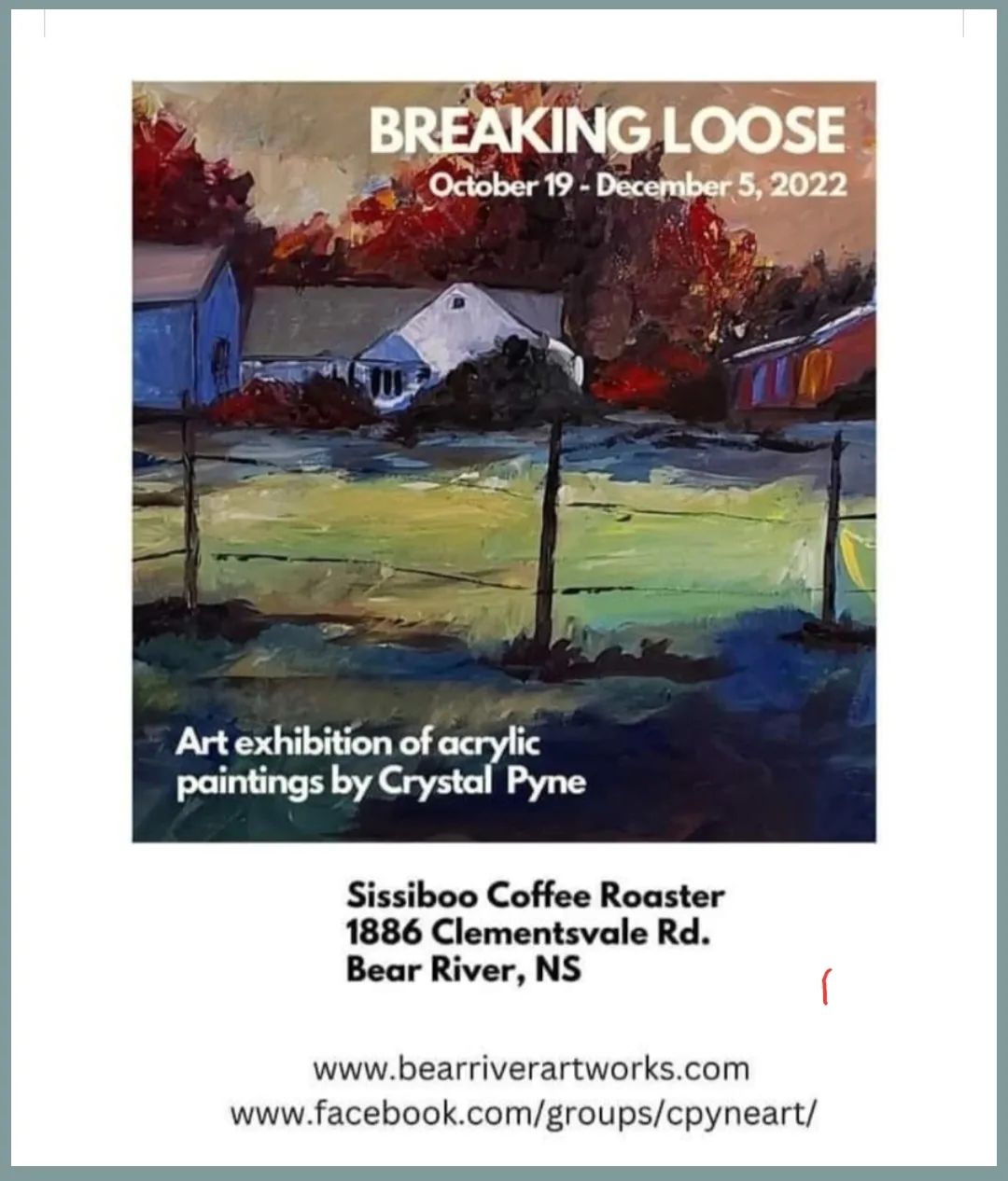 Let’s catch up over coffee! My BREAKING LOOSE show is now on display at Sissiboo Coffee Roaster in Bear River. I’ll be at the show Sat Oct 22 from 2-4pm and would love to see you!