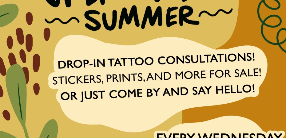 While we won’t be tattooing during these hours, we will be taking drop-in tattoo consultations (with the option to book the tattoo for another day!) We will also be selling all kinds of art and merch – stickers, t-shirts, prints, magnets, postcards and more! We accept cash, debit and credit.