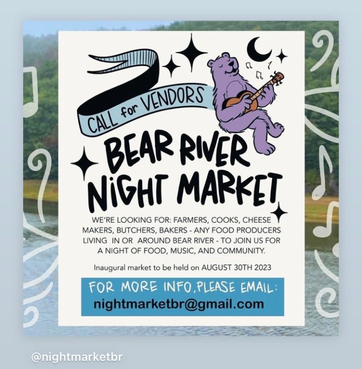 We’re looking for vendors for our inaugural night market! BRNM believes it’s so important to be able to buy groceries, baked goods, and locally made meals right in your own town, and we’re bringing that energy to Bear River on August 30th.