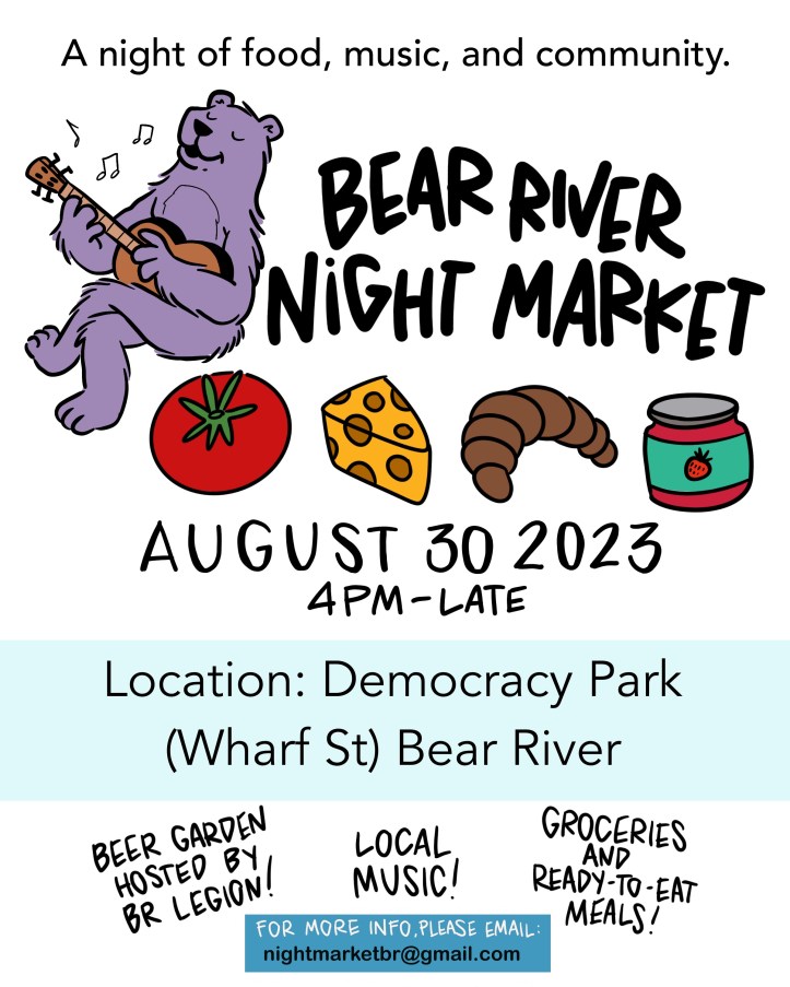 A night of food, music, community, and fun on Bear River’s waterfront. Join us for the first Bear River Night Market – a market with a focus on local food security and creating a space for the community to come together. The first market will be held this August.