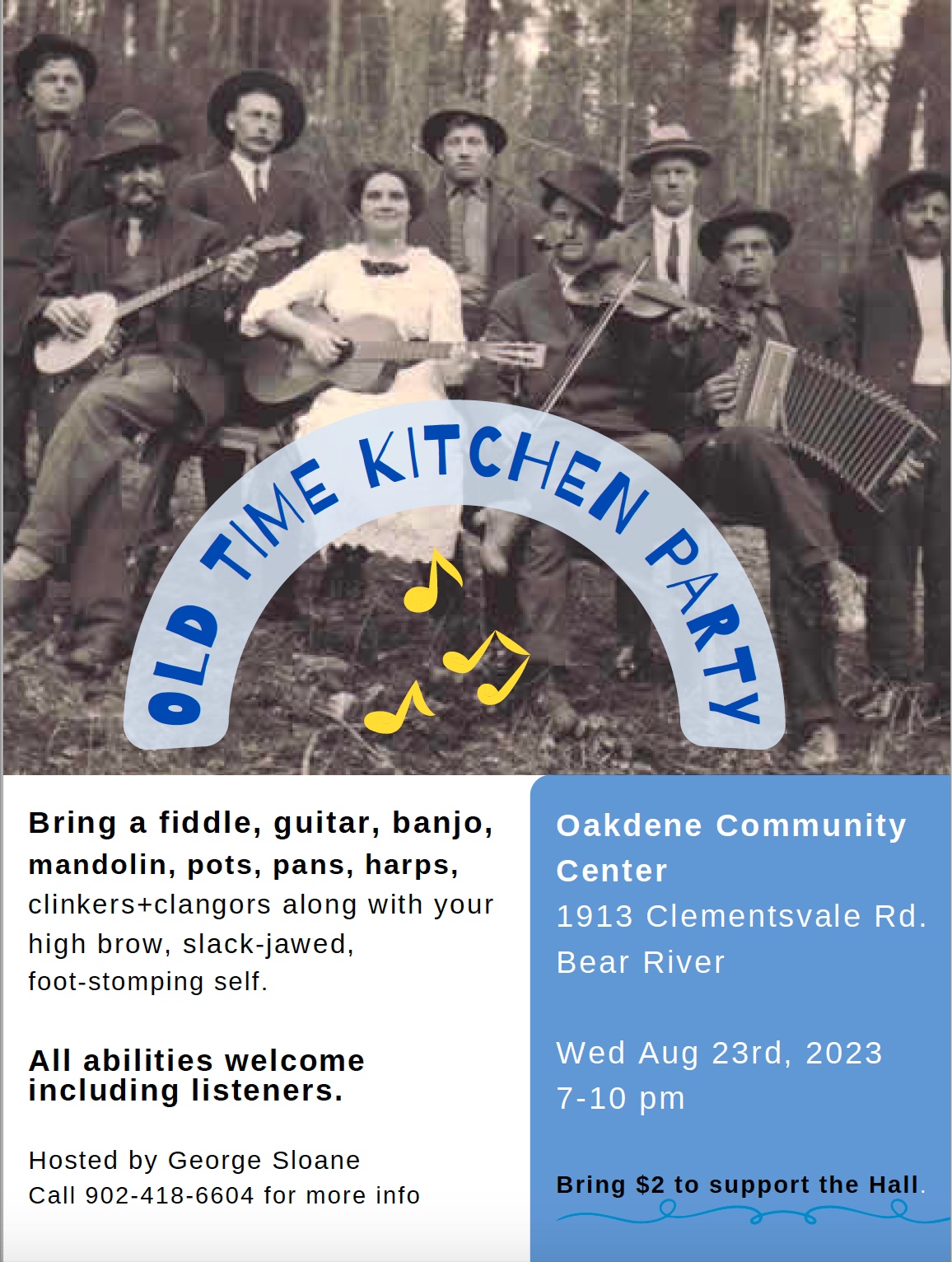 Come one, Come all and join in Bear River’s old time kitchen party ..bring a fiddle, guitar, Banjo, mandolin, pots, pans, clinkers clangors,,harps along with your high brow, slack jawed, foot stomping, down home self . Don’t forget your cousins and relatives three times removed…